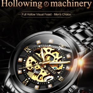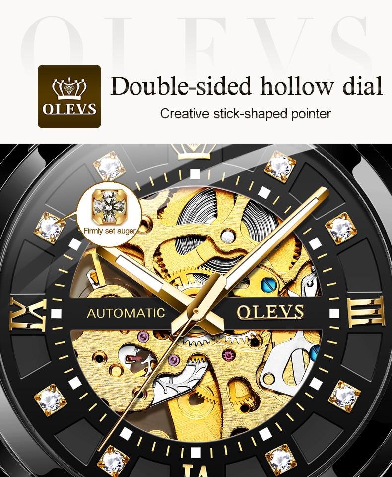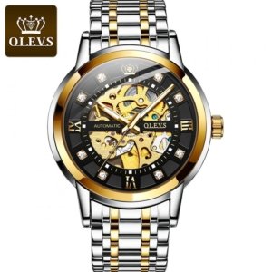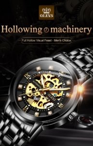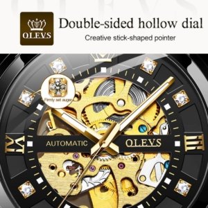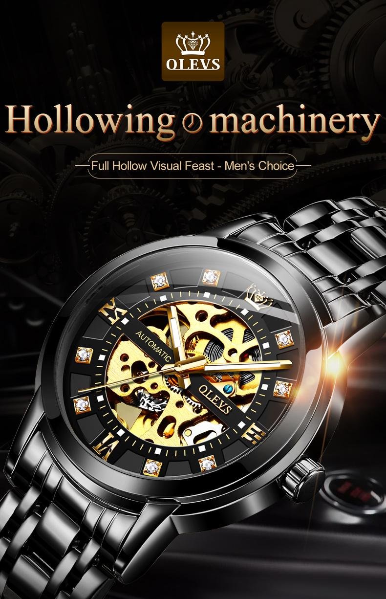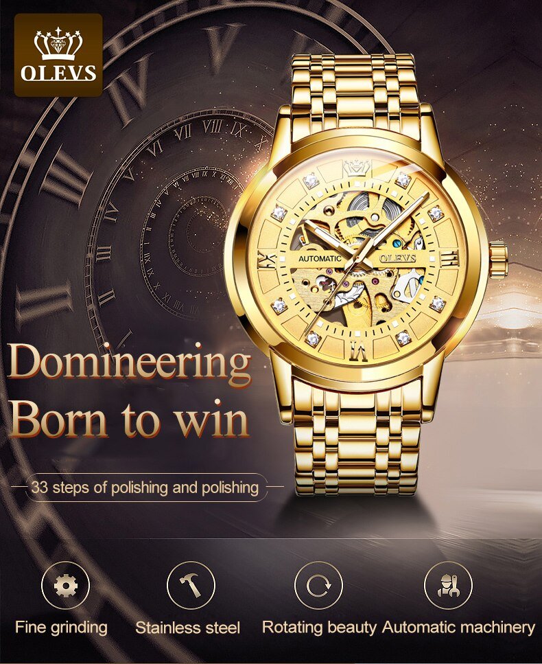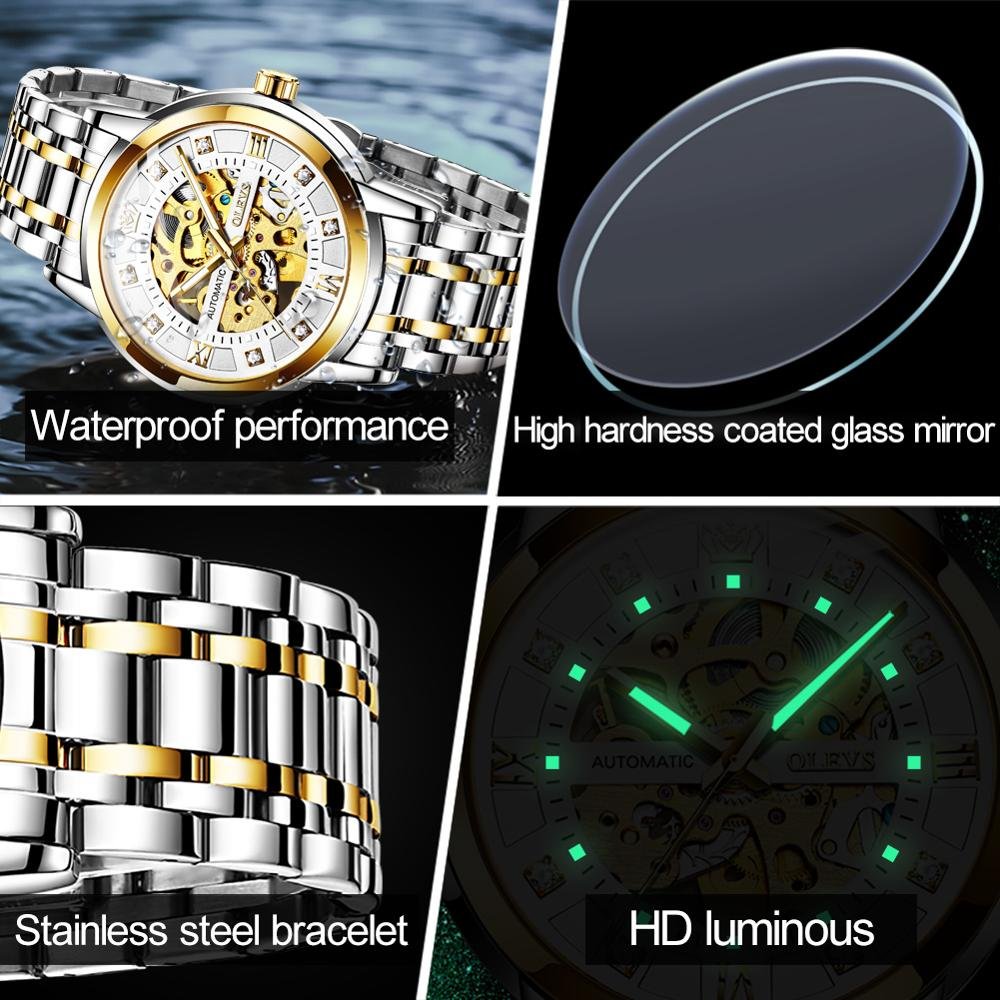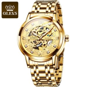 OLEVS Men’s Gold Skeleton Dial Watch Top Luxury Brand Expensive Automatic Mechanical Quality Watch Stainless Steel Watch Male